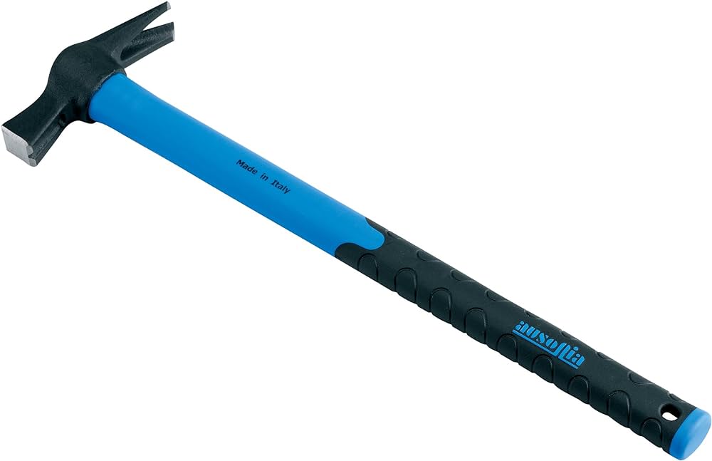 Testa in acciaio C45 forgiato e temprata ad induzione con magnete fermachiodo, manico in fibra di vetro con impugnatura in gomma antiscivolo.