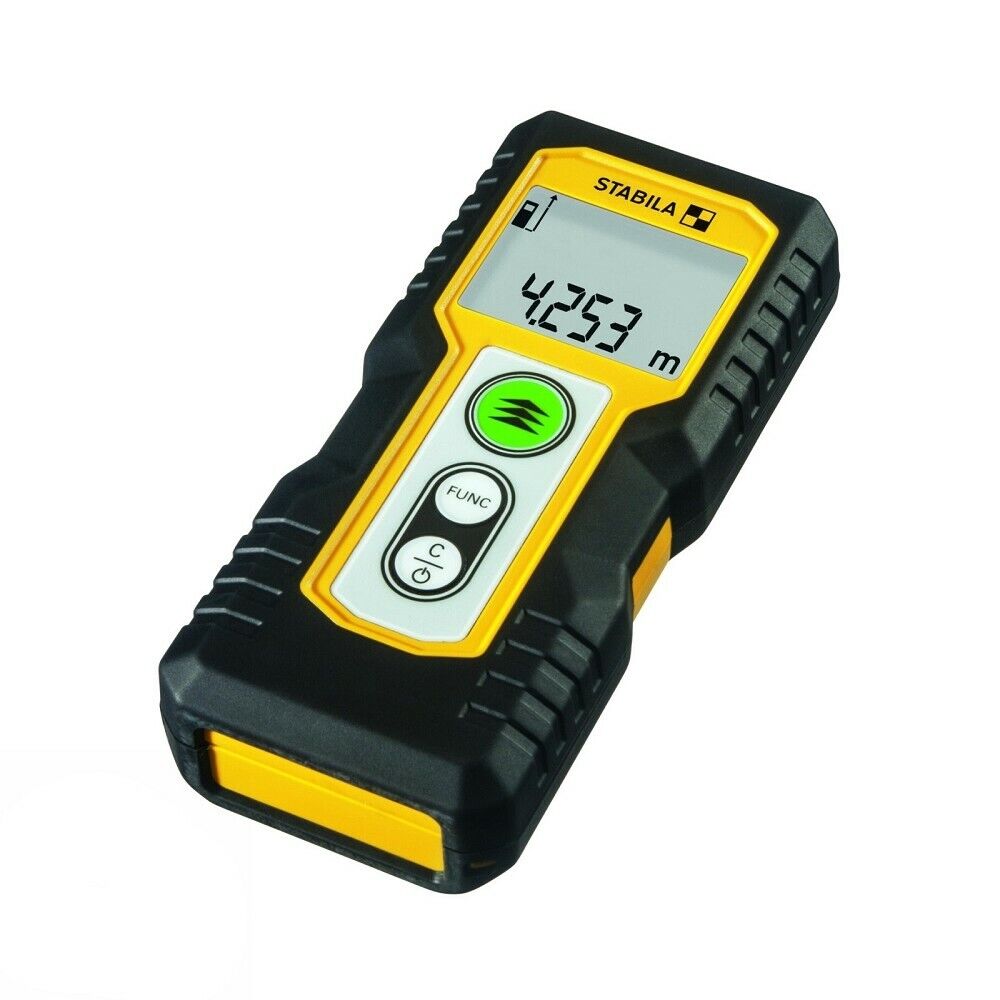 Compatto e facile da utilizzare dispone di quattro funzioni di misurazione di base (lunghezza, superficie, volume e misurazione continua). Determinazione rapida dei risultati di misurazione. Facilità di lettura grazie alle cifre di grandi dimensioni. Alloggiamento robusto con rivestimento Softgrip STABILA resistente agli urti. Misuratore di distanza con certificazione ISO. I valori relativi alla portata (0,2 - 30 m) e alla precisione (± 3,0 mm) soddisfano la norma internazionale 16331-1. Classe di protezione IP 54: protezione dalle infiltrazioni di polvere all'interno, protezione dagli spruzzi d'acqua da tutte le direzioni.