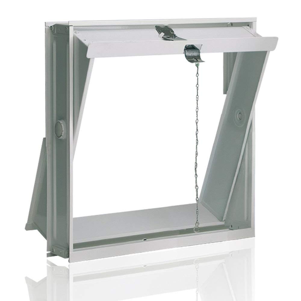 In lamiera zincata smaltata bianca. Apribile a 'bilico' è utilizzato per favorire l'areazione di locali o disimpegni su pareti o riquadri realizzati in vetromattone.