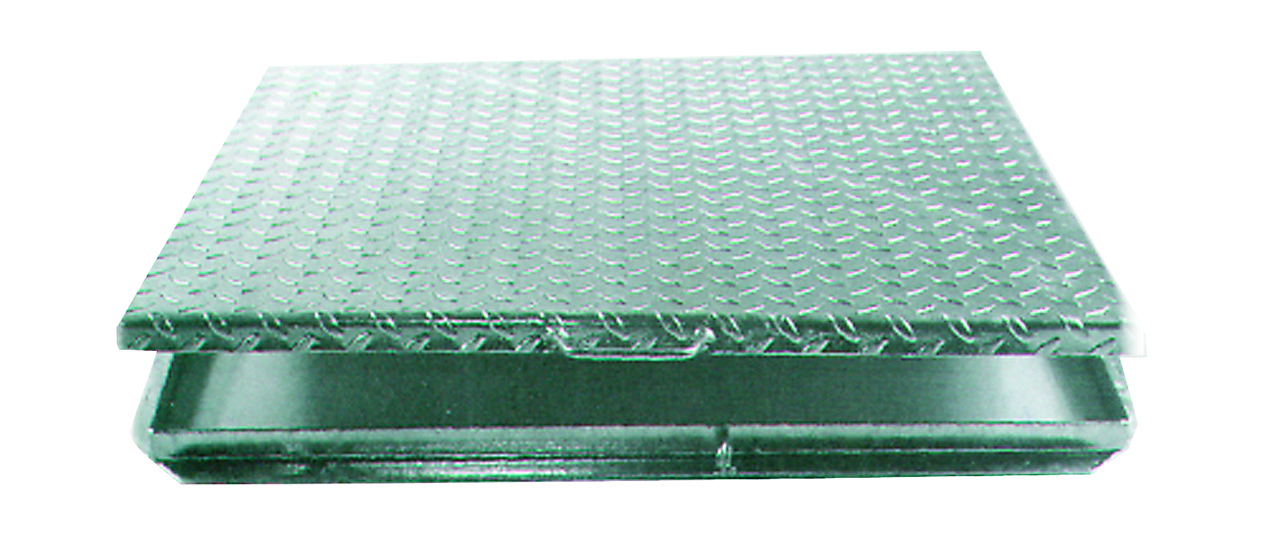 In acciaio zincato a caldo con coperchio rinforzato in lamiera bugnata spessore 30/10, telaio a 'T' e doppia cerniera.