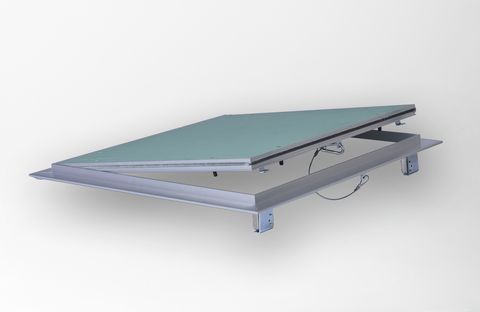 Linea professionale di botole in alluminio con sportelli in cartongesso Akifix®.Lastra 13 mm. Telaio robusto che impedisce qualsiasi flessione. Chiusura ermetica della botola grazie alla guarnizione antipolvere. Botola applicabile a soffitto, colore alluminio “naturale”.