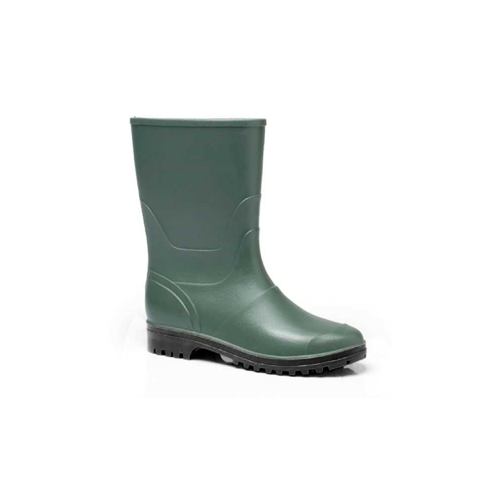 In PVC colore verde. Fodera interna in maglia di cotone. Suola carrarmato colore nero resistente agli oli e carburanti.
