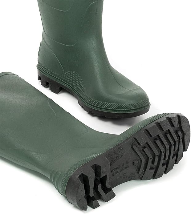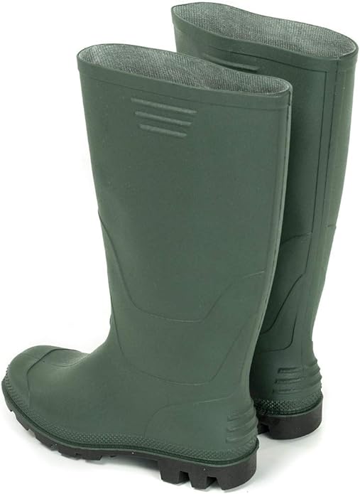 In PVC colore verde. Fodera interna in maglia di cotone. Suola carrarmato colore nero resistente agli oli e carburanti.