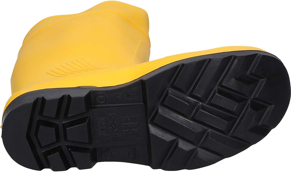In PVC colore giallo. Fodera interna in poliestere. Suola carrarmato colore nero, antistatica, antiscivolo e resistente a idrocarburi e oli minerali. Puntale e lamina antiforo in acciaio.