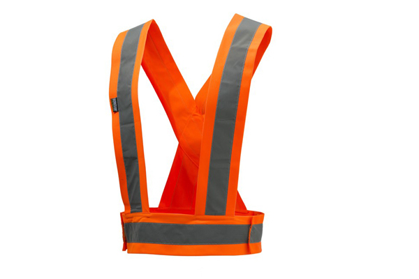 In tessuto poliestere/poliuretano. Con bande retroriflettenti, fascia in vita regolabile con velcro. Colore arancio.