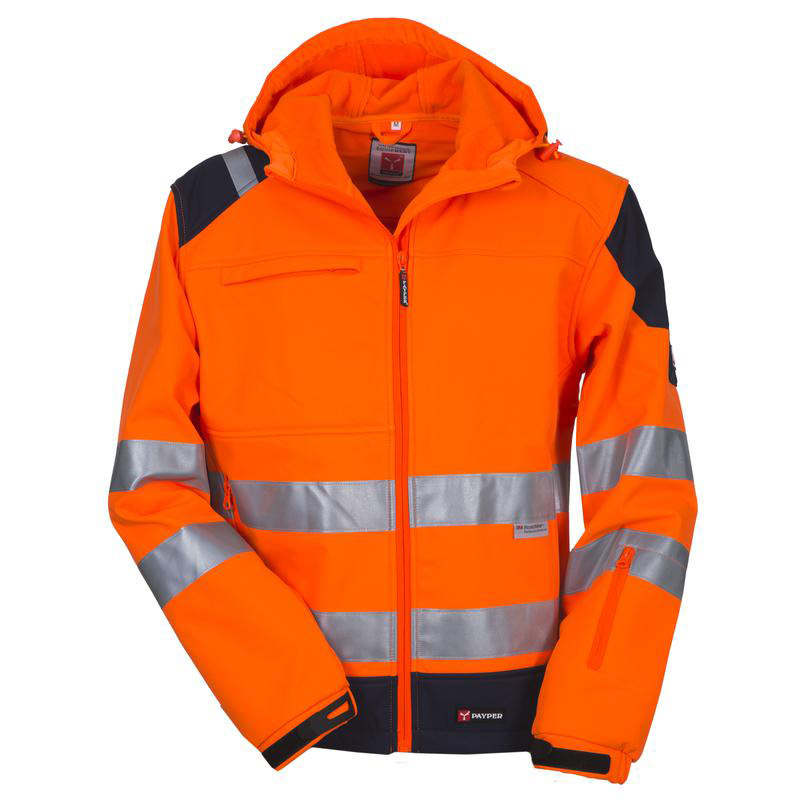 Tessuto poliestere/PVC, imbottitura e fodera interna in poliestere. Bande segnaletiche fluorescenti, chiusura con cerniera e bottoni automatici, cappuccio imbottito staccabile con cerniera. Quattro tasche esterne con patta e velcro, tasca interna, taschin