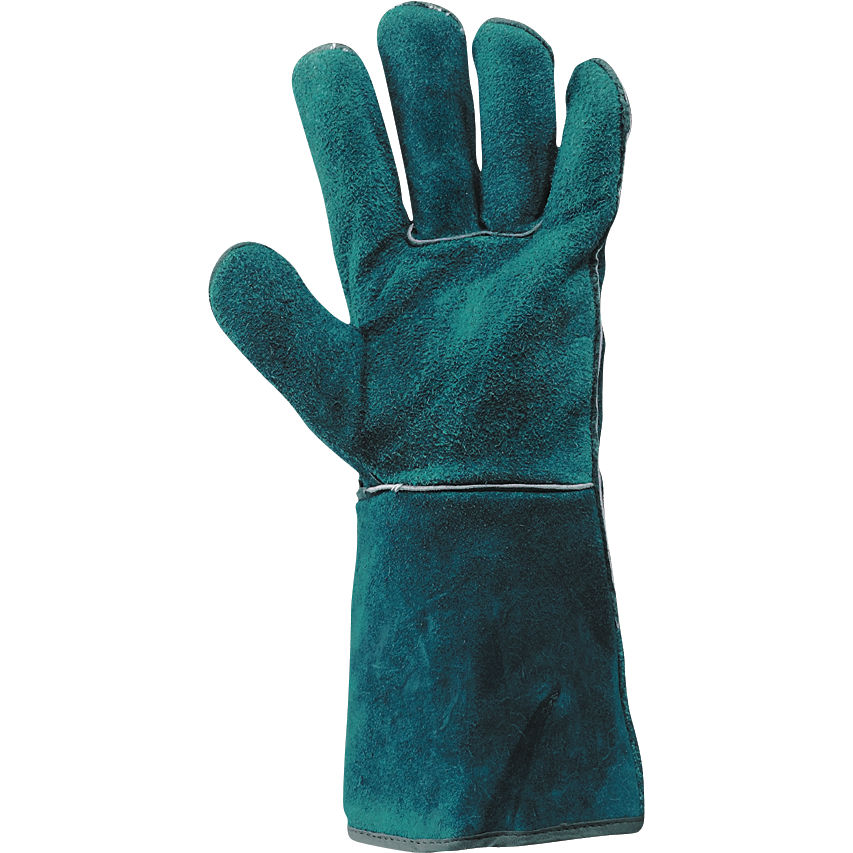 Completamente in crosta, foderato internamente in tessuto, manichetta di sicurezza in crosta cm.14 con bordo orlato. Indicato per la saldatura manuale dei metalli, lavori in fonderie, manipolazione di prodotti siderurgici.