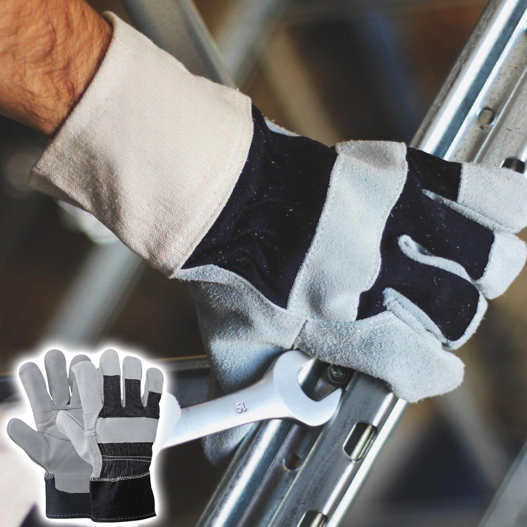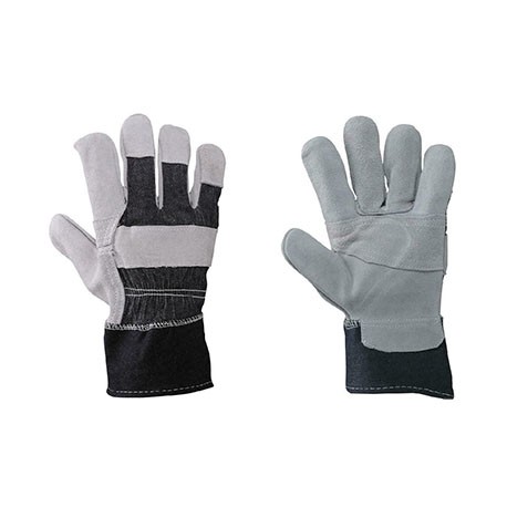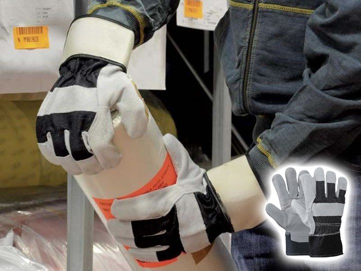 Palmo in crosta rinforzato, dorso in tela jeans, manichetta di sicurezza tela di cotone orlata, interamente foderato sul palmo, elastico interno stringipolso. Indicato per la manipolazione di casse, cartoni, operazioni di carico e scarico, manutenzioni ge