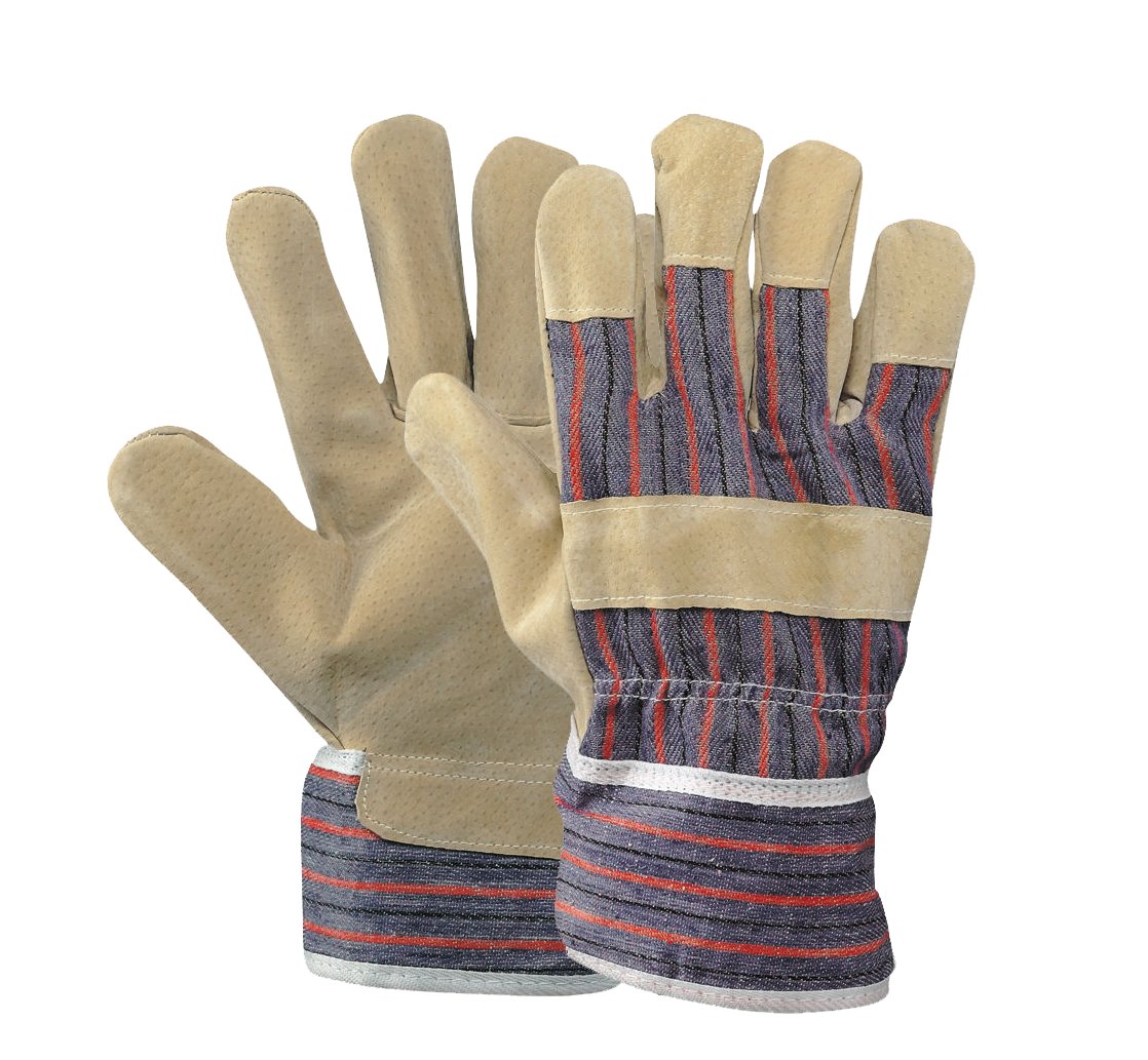 Palmo in crosta suina, dorso e manichetta di sicurezza in tela di cotone orlata, foderato internamente in cotone, elastico interno stringipolso. Indicato per la manipolazione di utensili, casse di legno, cartone e plastica, stoccaggio e lavori agricoli.