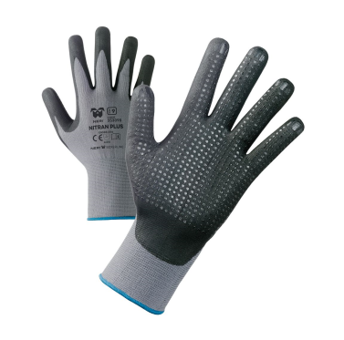 Palmo ricoperto in nitrile schiumato, Antipelucchi, Palmo puntinato per una miglior presa, Ottima resistenza all'abrasione e al contempo notevole flessibilità e destrezza, Forma ergonomica, assenza di cuciture, ottimo comfort di calzata, Polso elasticizzato e dorso aerato, Colore: grigio/nero.