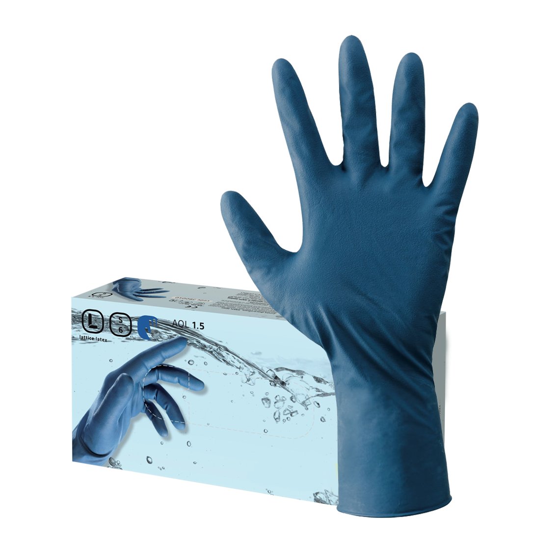 In lattice di gomma naturale spessorato per alti rischi, senza polvere, superficie microruvida, polso con bordino, lunghezza cm.30. Indicato per l'industria chimica, farmaceutica, laboratori estetica ed igiene per la collettività, lavorazioni meccaniche in officine e carrozzerie. Idonei al contatto con alimenti. Colore blu scuro.