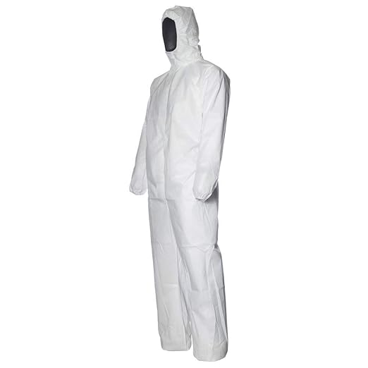 Tessuto non tessuto in polipropilene spalmato in polietilene, 65 g/m². Con cappuccio, chiusura con cerniera singola cursore e patta adesiva. Elastico al cappuccio, in vita e alle caviglie, polsini in maglia. DPI 3ª categoria, livelli di prestazione Tipo 5 e Tipo 6. Colore bianco.