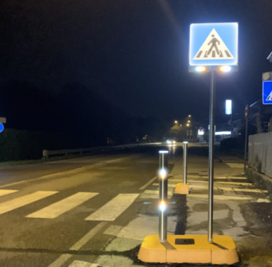 In lamiera spessore 1 mm, rifrangente di Classe 1 (7 anni). Localizza un attraversamento pedonale non regolato da semaforo e non in corrispondenza di intersezioni.