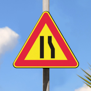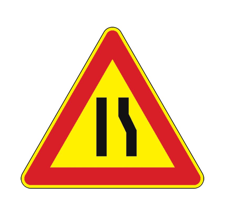 In lamiera spessore 1 mm, rifrangente di Classe 1 (7 anni). Presegnala un restringimento pericoloso della carreggiata posto sul lato destro.