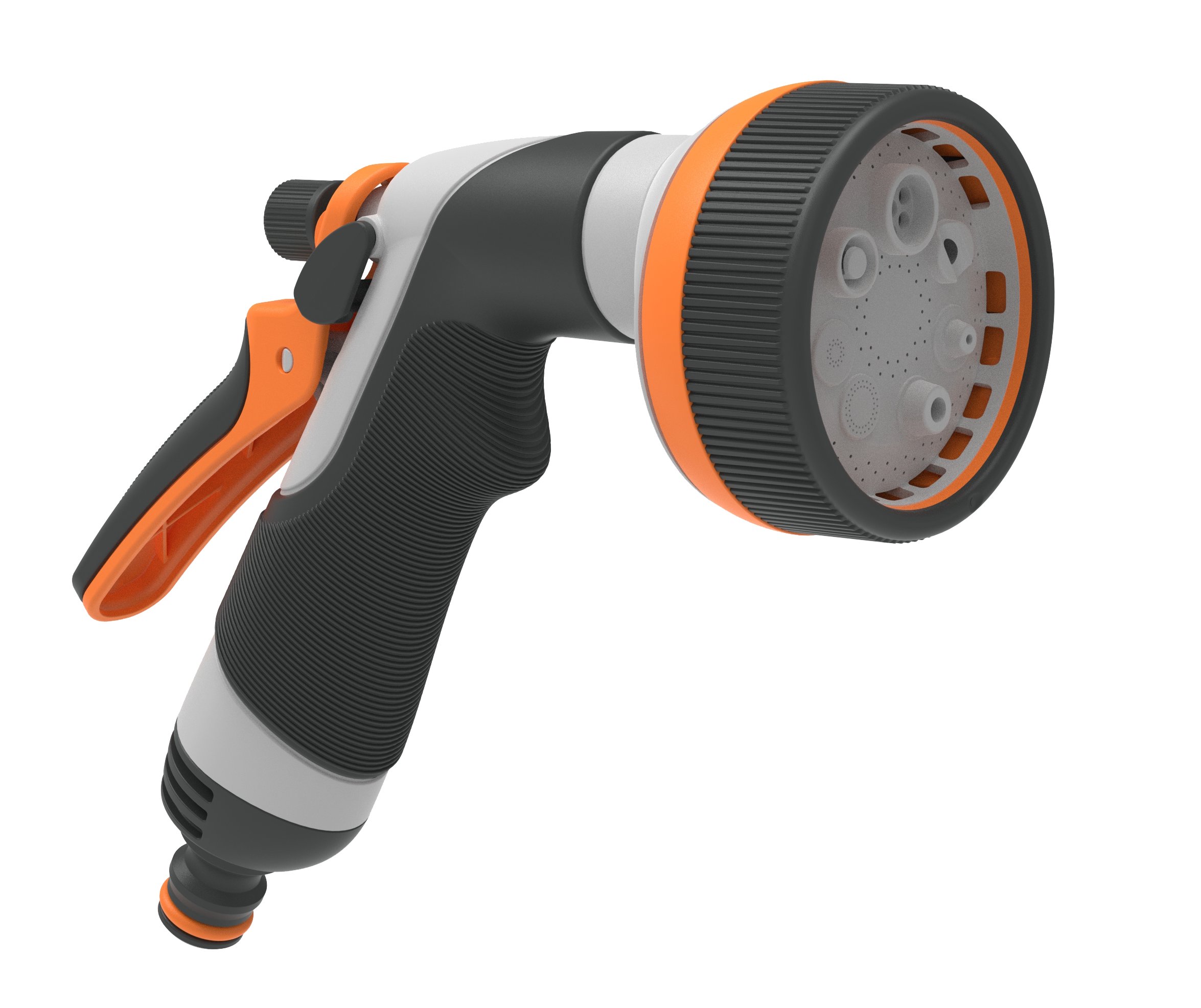 Consente di selezionare ben 8 tipi di getto diversi con la semplice rotazione della ghiera. Impugnatura ricoperta da morbida gomma antiscivolo. Leva di regolazione posteriore per il blocco del getto. Portata massima 10l/min a 4 bar. Confezione blister.