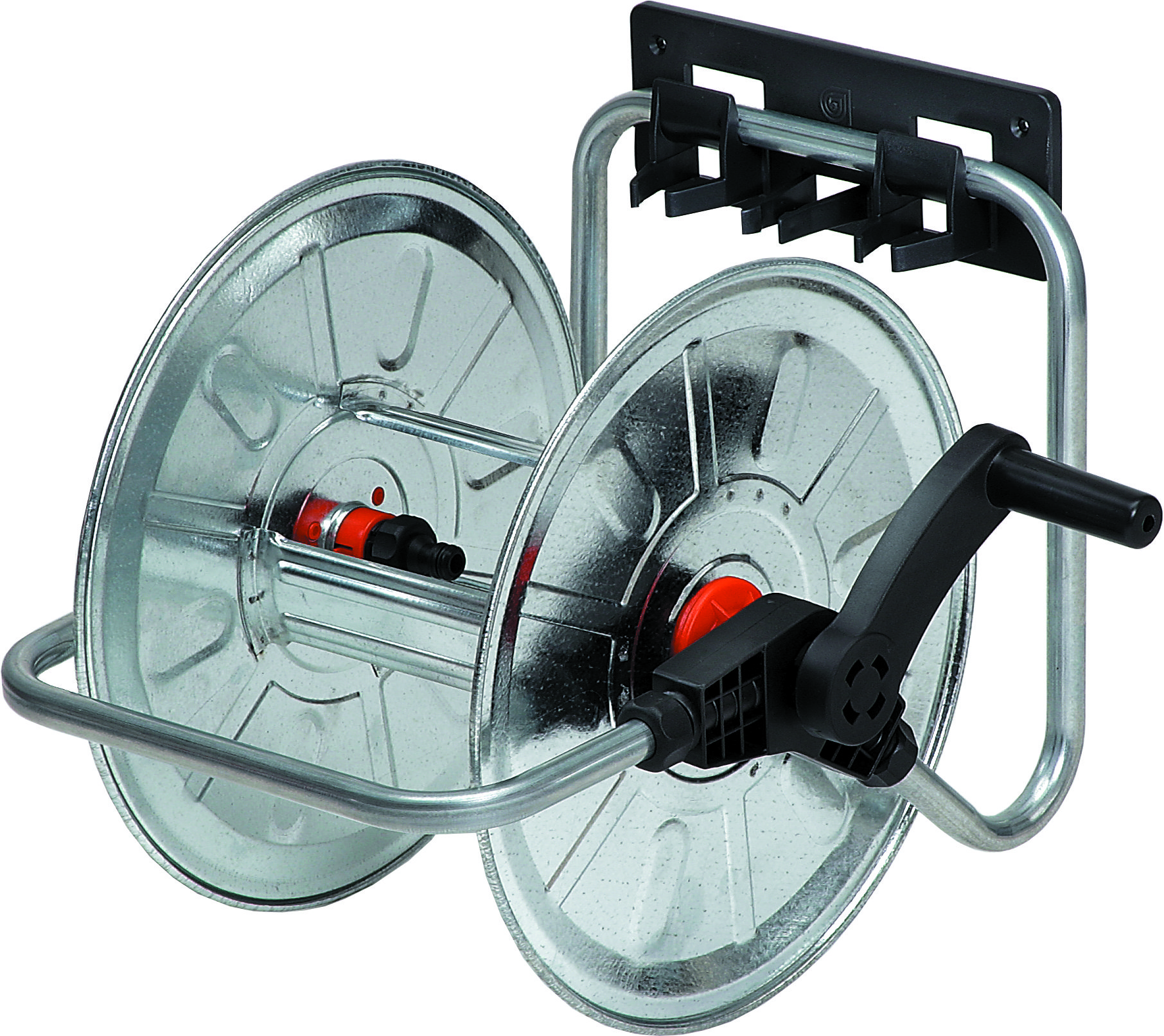 In lamiera e tubo d'acciaio zincati. Completo di staffa per applicazione a muro. Portata tubo: 50 m da 1/2".