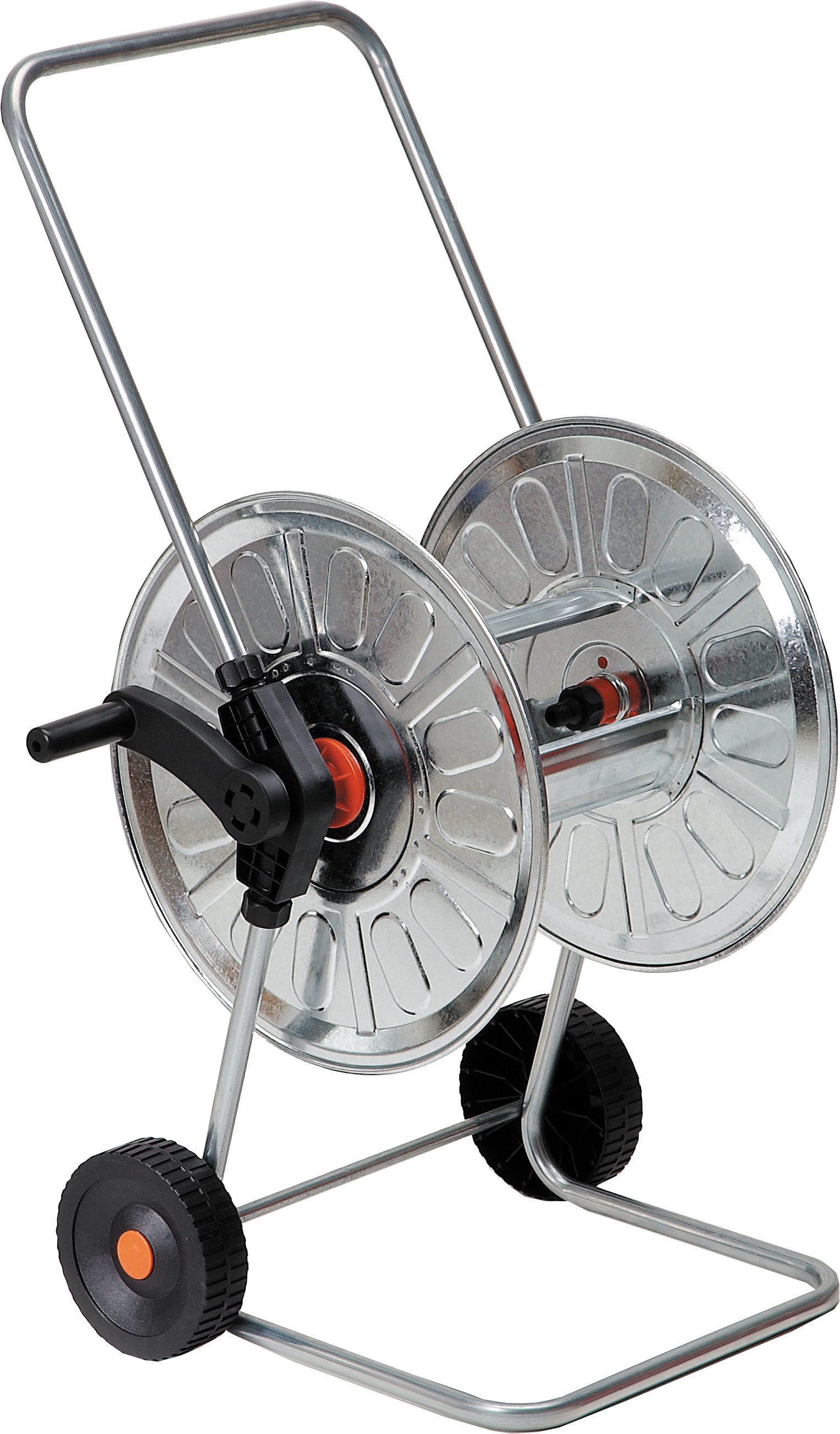 Telaio e rullo in acciaio zincato, ruote in polipropilene. Adatto a piccole e medie superfici. Portata tubo: 80 m da 1/2" o 50 m da 3/4".