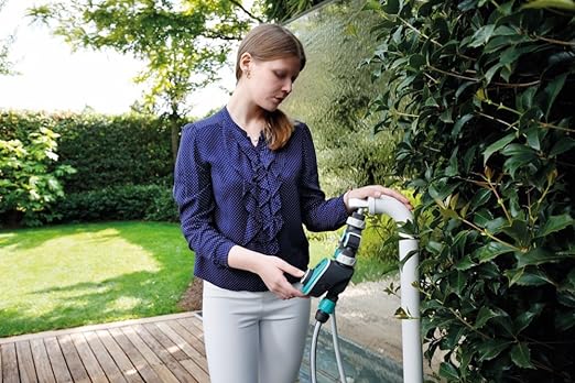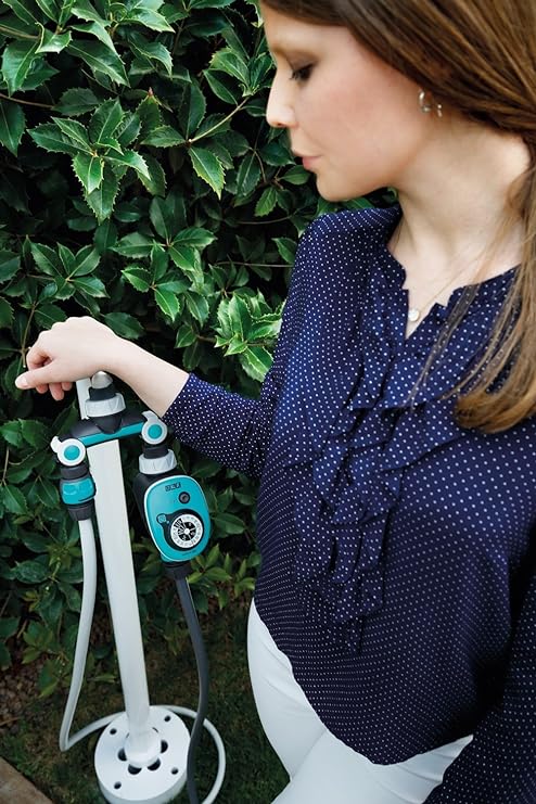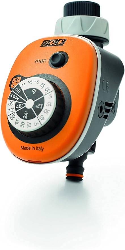 Dispone di programmi combinabili tra loro fino a 16+1 possibilità, gestibili attraverso il comodo selettore a manopola. Partenze ogni 6, 12, 24, 48 ore con tempi di irrigazione prefissati. Programma 'Easy garden' per l'ottimizzazione dei cicli di irrigazione: due irrigazioni giornaliere preimpostate per innaffiare correttamente mattina e sera. Possibilità di partenze manuali al di fuori dei cicli di programmazione. Dispositivo di arresto del flusso dell'acqua in caso di esaurimento della batteria. Funziona con batterie alcalina da 9 Volt. Attacco al rubinetto da ¾". Pressione massima di utilizzo 8 Bar.