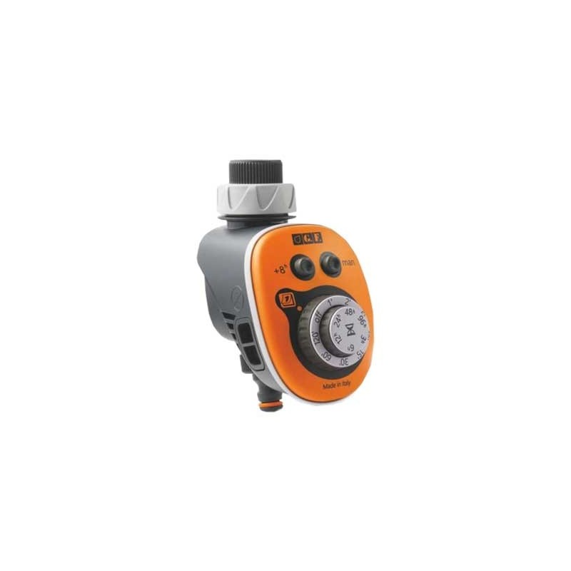 Dispone di programmi combinabili tra loro fino a 48 possibilità, gestibili attraverso i comodi selettori a manopola concentrica. Partenze ogni 3, 6, 12, 24, 48, 96 ore per 1, 2, 5, 10, 15, 30, 60, 120 minuti. Possibilità di partenze manuali al di fuori dei cicli di programmazione. Tasto partenza ritardata di 8 ore dopo l'impostazione iniziale. Dispositivo di arresto del flusso dell'acqua in caso di esaurimento della batteria. Funziona con batterie alcalina da 9 Volt. Attacco al rubinetto da ¾". Pressione massima di utilizzo 8 Bar.