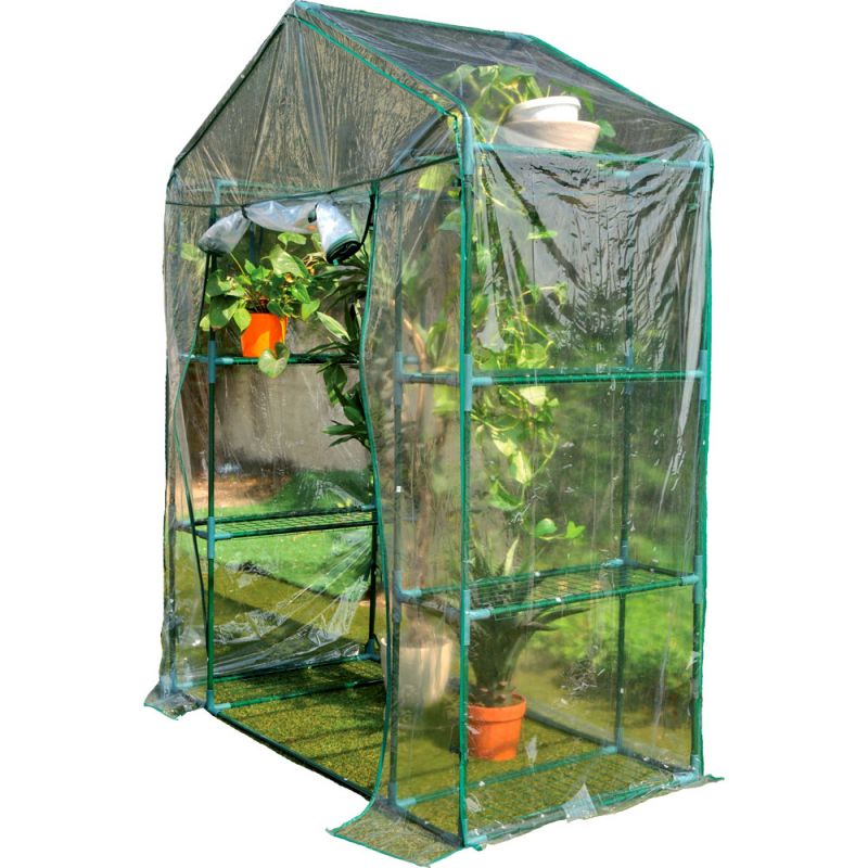 Struttura in acciaio verniciato con polveri epossidiche anti-ruggine. Telo di copertura in PVC di alta qualità con filtro UV. Sistema di chiusura a doppia cerniera che consente un facile accesso all'interno. Il montaggio della serra è rapido, senza l'aiuto di attrezzi. Completa di ripiani di appoggio in metallo verniciato.