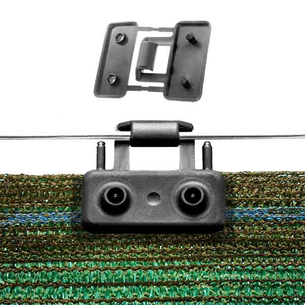 Ideale per reti frangi-vista e ombreggianti. Alta resistenza agli agenti atmosferici. Si ancora direttamente al filo grazie al gancio presente nelle parte superiore. Si fissa sulla rete a pressione grazie alle 2 punte a scatto. Adatta ad ogni tipo di rete.