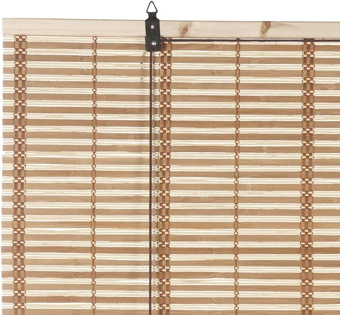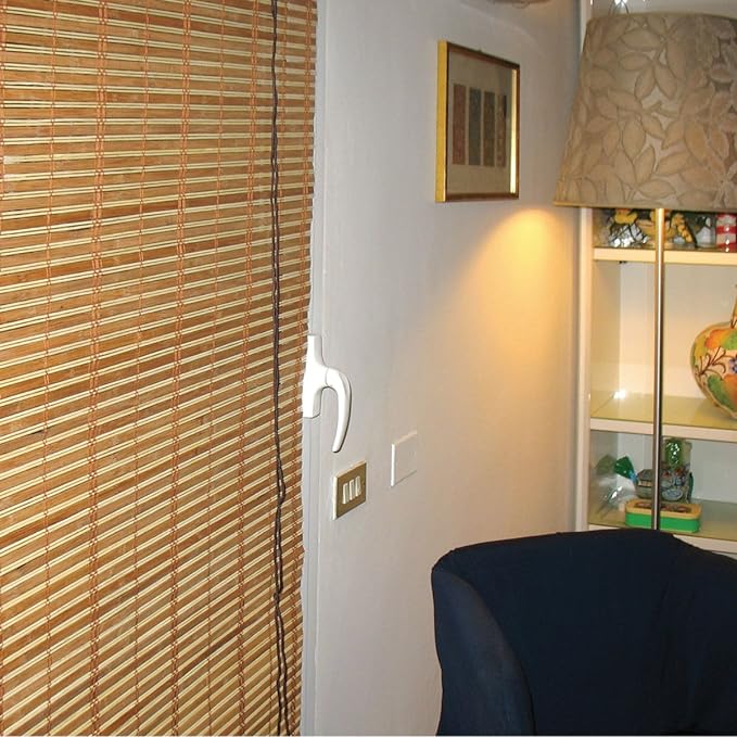In listelli di bamboo da 20 mm legate con filo di cotone, supporto in legno con ganci di ancoraggio in metallo. Arrotolamento con carrucola.