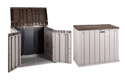 Box per esterni con 2 ante a battente effetto legno, con apertura indipendente dal top. Fondo con feritoia antiristagno, scivolo anteriore per il rimessaggio, predisposizione per fissaggio al suolo. Chiusura con maniglione. Resistente ai raggi UV. Da montare. Pulire con acqua e sapone. Volume 842 litri.
