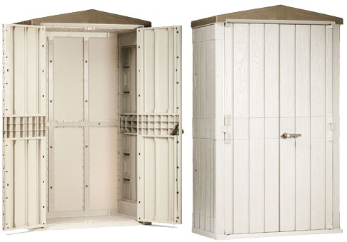 Box per esterni con 2 ante a battente effetto legno. Possibilità di fissaggio a muro. Predisposizione per lucchetto. Adatti a qualsiasi tipo di utilizzo sia all'interno che all'esterno dell'abitazione. Resistente ai raggi UV. Da montare. Pulire con acqua