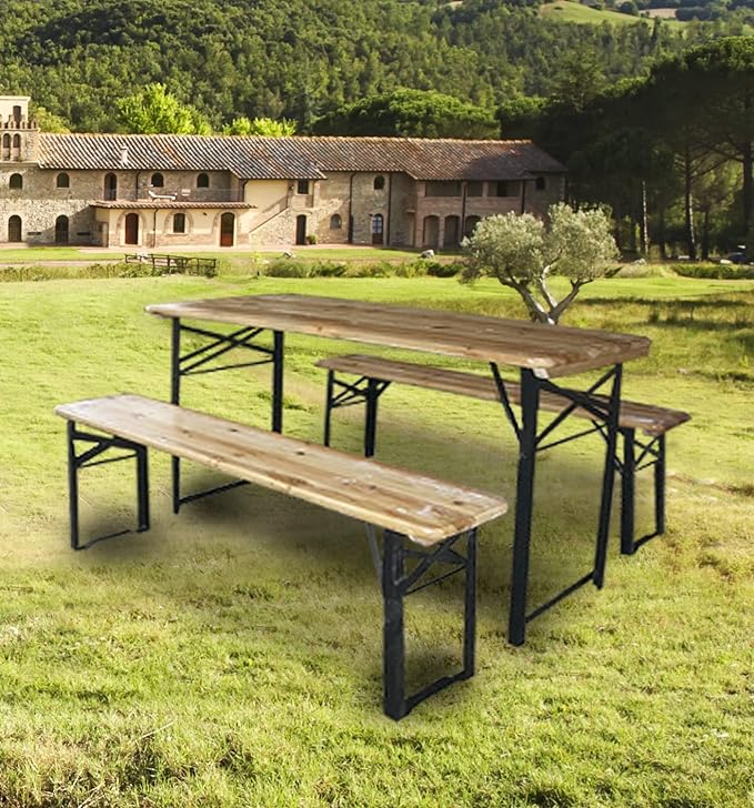 Struttura in ferro verniciato e legno di abete con gambe pieghevoli. Composto da: 2 panche cm.220x70 con 3 gambe di sostegno e 1 tavolo rettangolare cm.220x70x75h.