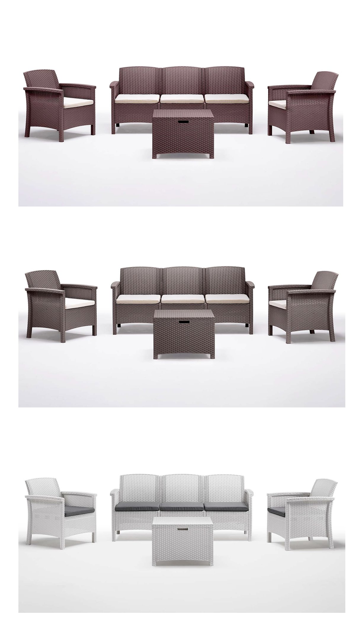 Set Venezia per 5 persone finitura rattan composto da: 2 poltrone con schienale alto ed ergonomico, 1 sofa 3 posti, 1 tavolino porta cuscini, 5 cuscini. Dimensioni (cm): Poltrona: 63x64,5x76h, Sofa: 172x64,5x76h, Tavolino: 60x54,5x40,5h. Peso 35Kg.