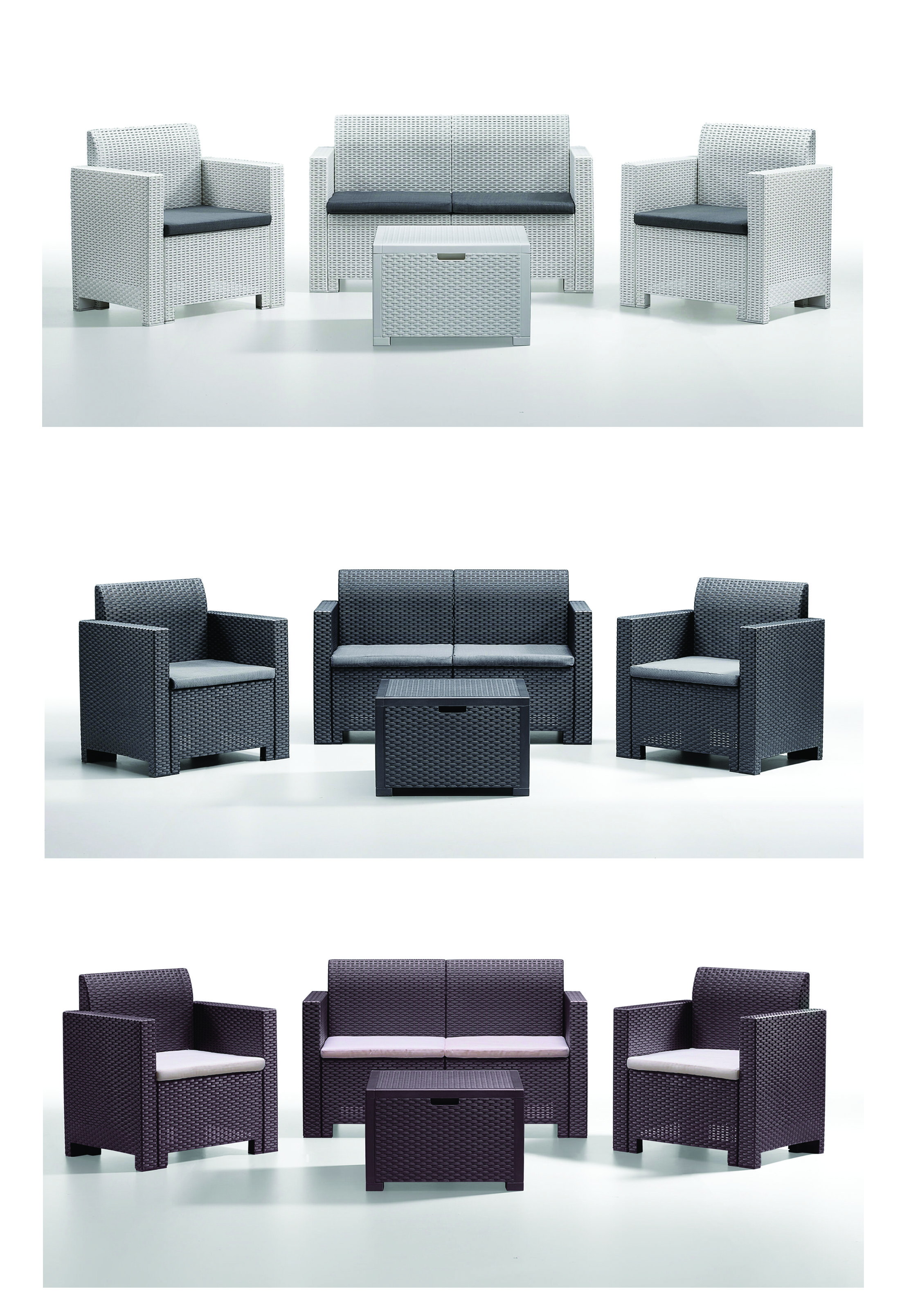 Set Nebraska per 4 persone finitura rattan composto da: 2 poltrone con schienale alto ed ergonomico, 1 sofa 2 postI, 1 tavolino porta cuscini, 4 cuscini. Dimensioni (cm): Poltrona 75x57,5x79h, Sofa 131x57,5x79h, Tavolino 64x64x40h. Peso: 44Kg