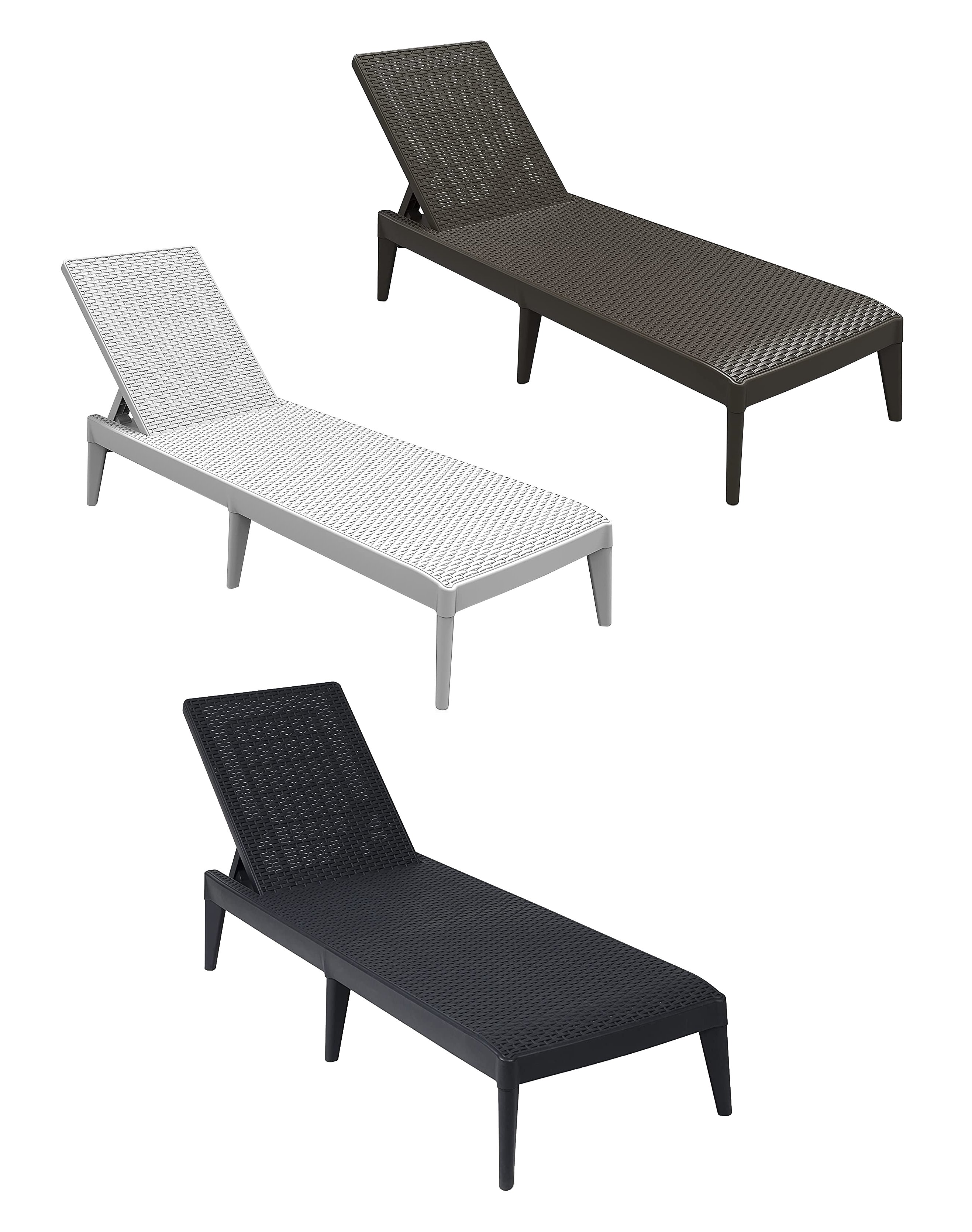 In plastica con finitura rattan. Anti-UV resistente alle intemperie. Schienale regolabile. Dimensioni: cm 60x186x29h