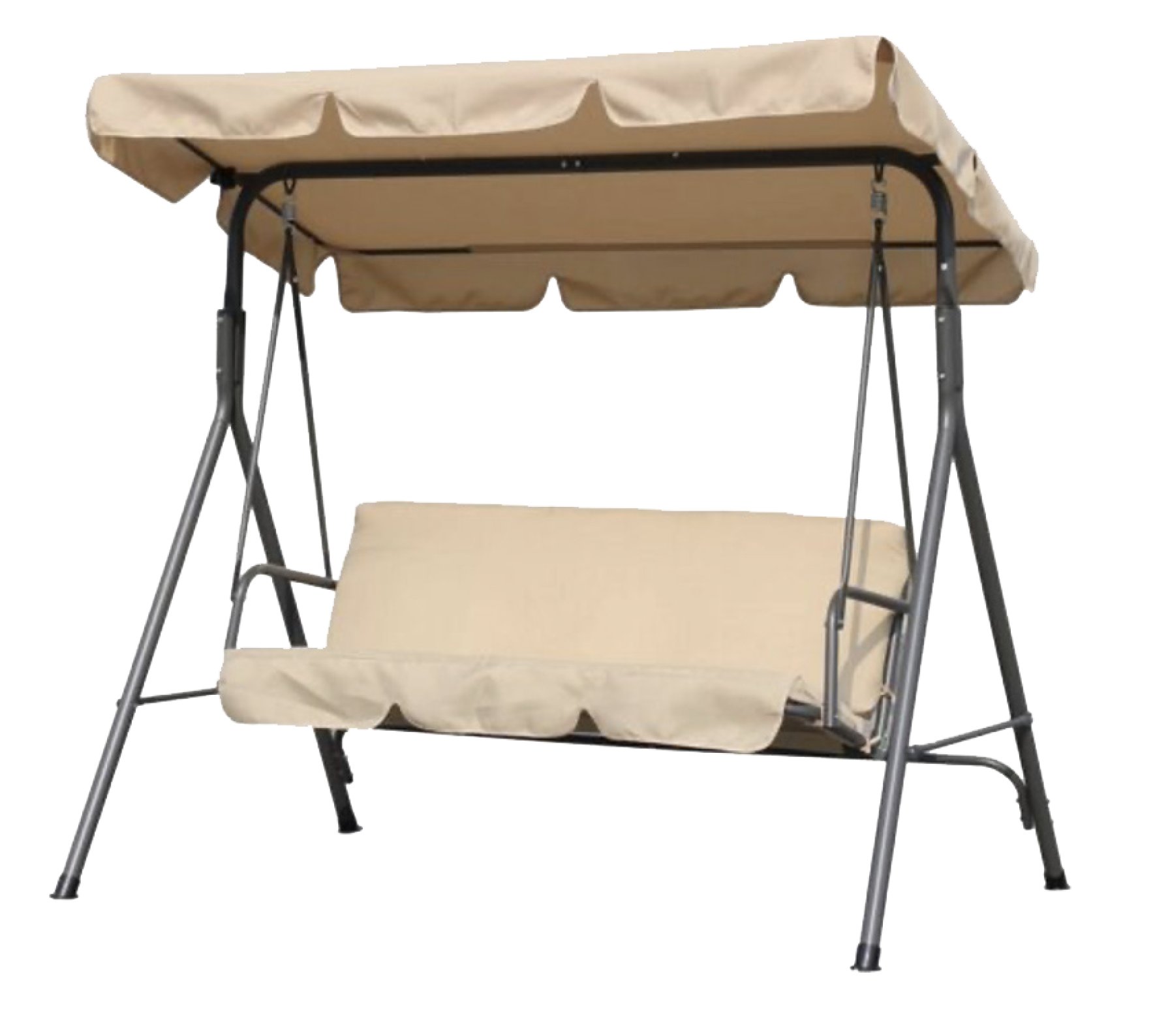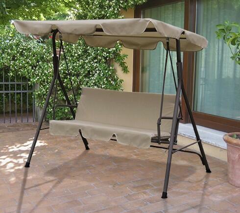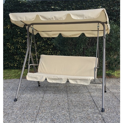 Dondolo in acciaio a 3 posti. Fodera: poliestere 160 g. Cuscino: poliestere 140 g. Telaio con verniciatura a polvere. Tubo: 38mm/28mm/25mm/22mm/19mm/16mm. Sedile e schienale: rivestimento in PVC beige oxford 300X600D.