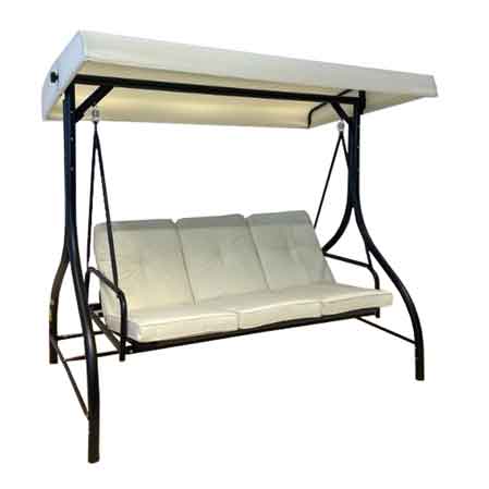 Poltrona letto a dondolo a 3 posti. Dimensioni: 194X120X173 cm. Telaio: acciaio verniciato a polvere. Tubi: 48 mm/28 mm/25 mm/19 mm/16 mm/22 mm. Seduta: rivestimento in PVC Oxford 300X600D. Cuscino: poliestere impermeabile 160 g