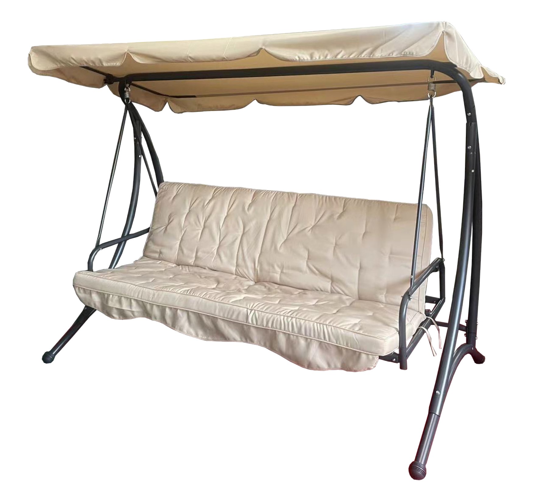 Dondolo in acciaio 3 posti con funzione letto. Dimensioni: 220x105x170 cm. Fodera: 180 g di poliestere, Cuscino: 160 g di poliestere, Telaio con verniciatura a polvere, Tubo d'acciaio: 48 mm/28 mm/25 mm/19 mm/16 mm; 40x20/36x16 mm. Sedile e schienale: rivestimento in PVC oxford 300X600D"