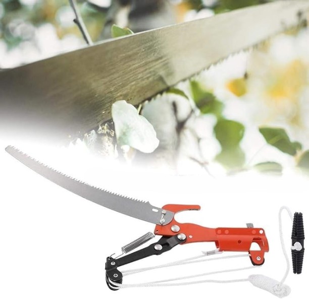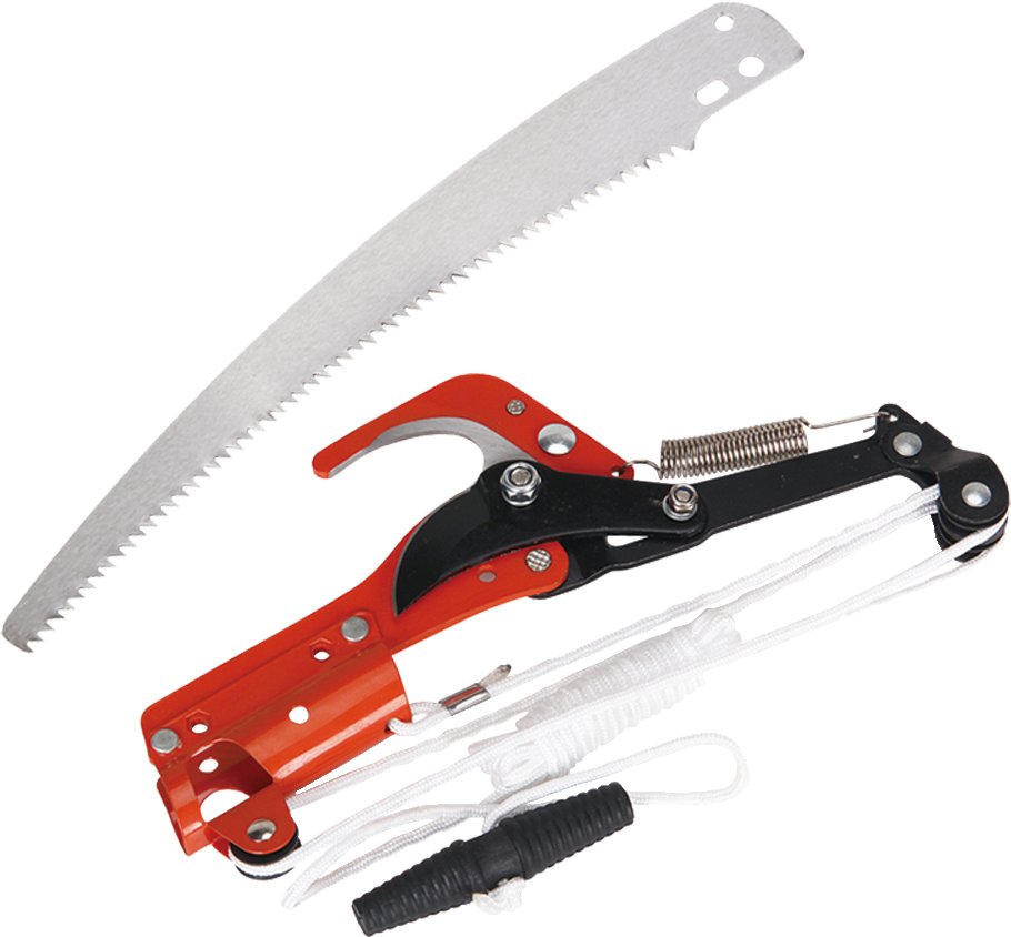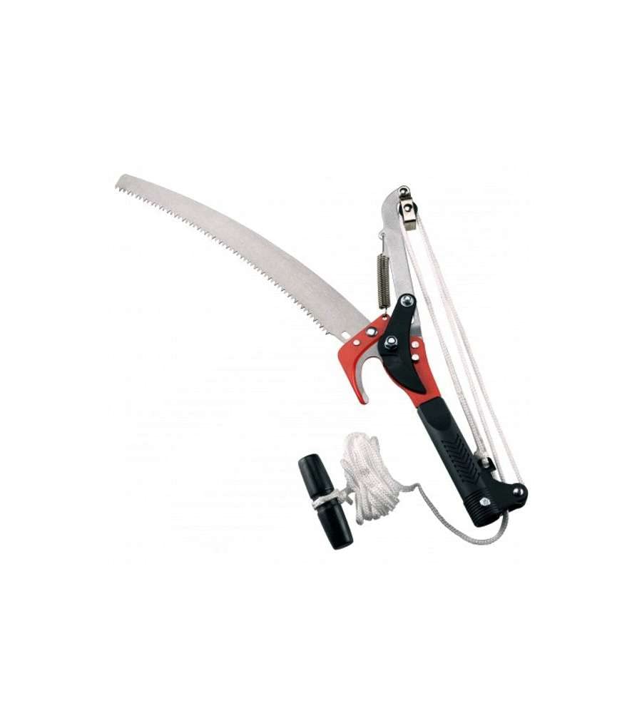 Potatore per alberi a tre pulegge. Lama in acciaio 1,2 mm. Lunghezza lama 34,5 cm. Lunghezza totale 54 cm. Corda in nylon da 350 cm.