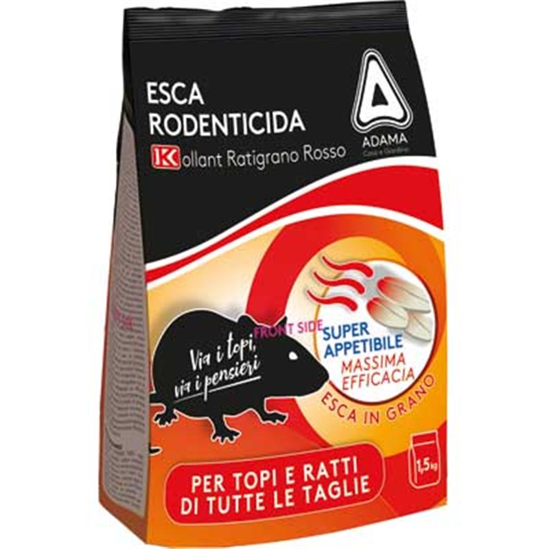 KOLLANT RATIBROM 5.0 GRANO è un'esca rodenti-cida a base di una sostanza anticoagulante nota come Bromadiolone, efficace contro topi e ratti dopo una sola ingestione. La formulazione è a base di cereali particolarmente allettanti e appetitoso per topolino domestico, ratto grigio e ratto nero. Il prodotto non mette in allarme né insospettisce altri membri della popolazione di roditori. KOLLANT RATIBROM 5.0 GRAIN contiene un agente amaricante al fine di evitare l'ingestione da parte di bambini. KOLLANT RATIBROM 5.0 GRAIN per uso professionale è indicato per l'uso all'interno ed intorno ad edifici civili e rurali, agglomerati indu-striali, depositi di merci, stive delle navi, depositi e vagoni ferroviari, comunità, scuole, abitazioni, can-tine, garage, ripostigli.