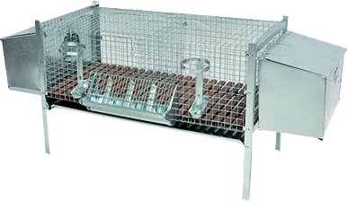 Pieghevole, realizzata in rete zincata e fondo in plastica. Dotata di due nidi esterni, una mangiatoia con portafieno in lamiera zincata, due abbeveratoi portabottiglia.