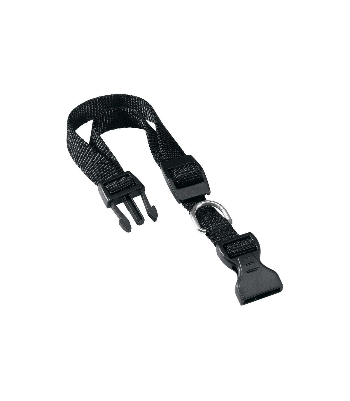 In nylon resistente. Chiusura con clip a scatto. Regolabile in lunghezza tramite fibbia a scorrimento.