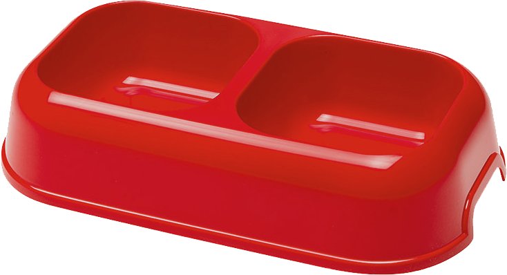 In plastica, con bordo inferiore dotato di gomma antiscivolo. Con doppio scomparto è ideale per fornire allo stesso tempo cibo e acqua al gatto o al cane.