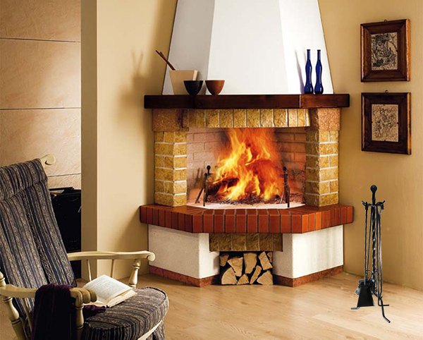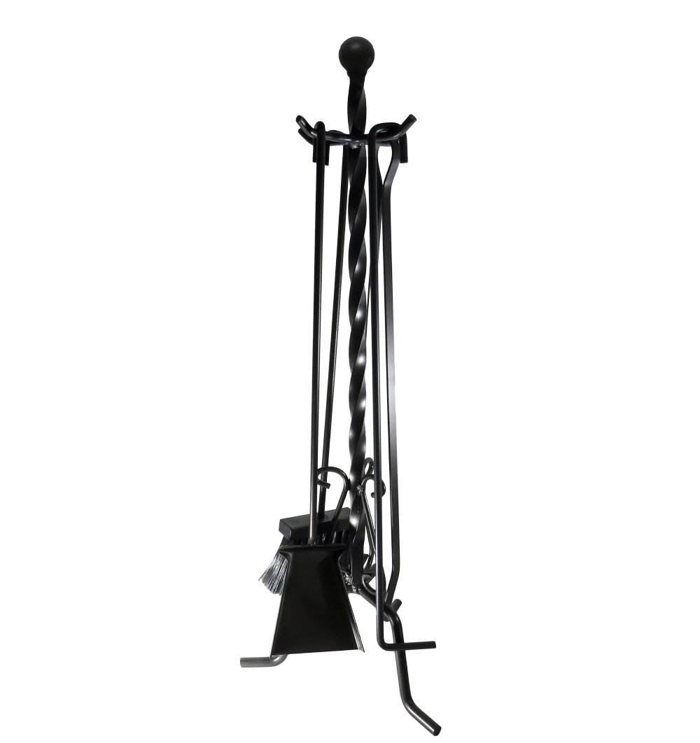 In ferro battuto verniciato. Completo di paletta, molla, attizzatore e scopino.