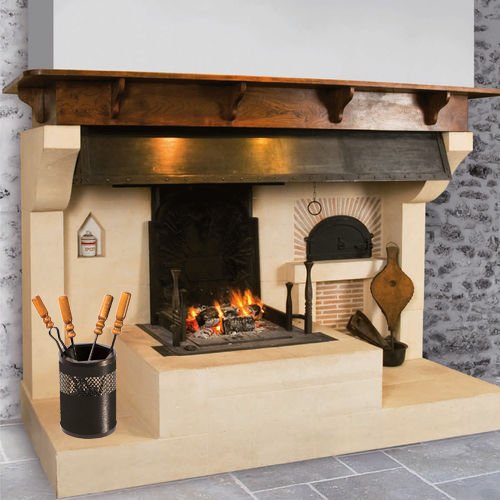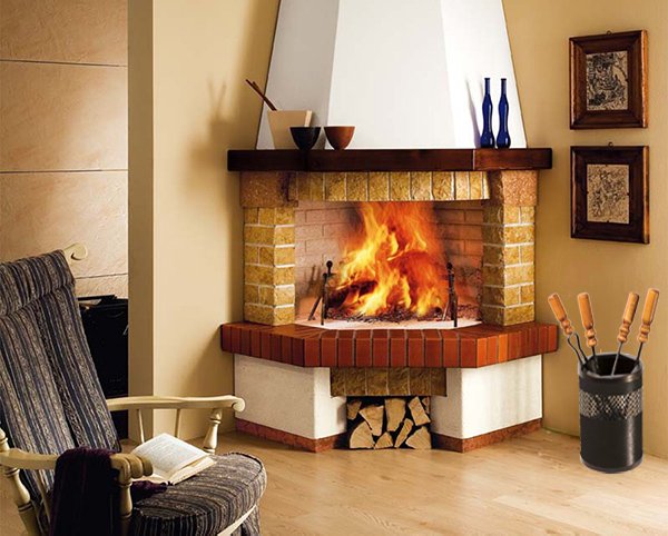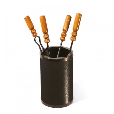 In ferro battuto verniciato. Completo di paletta, molla, attizzatore e scopino. Manico attrezzi in legno.