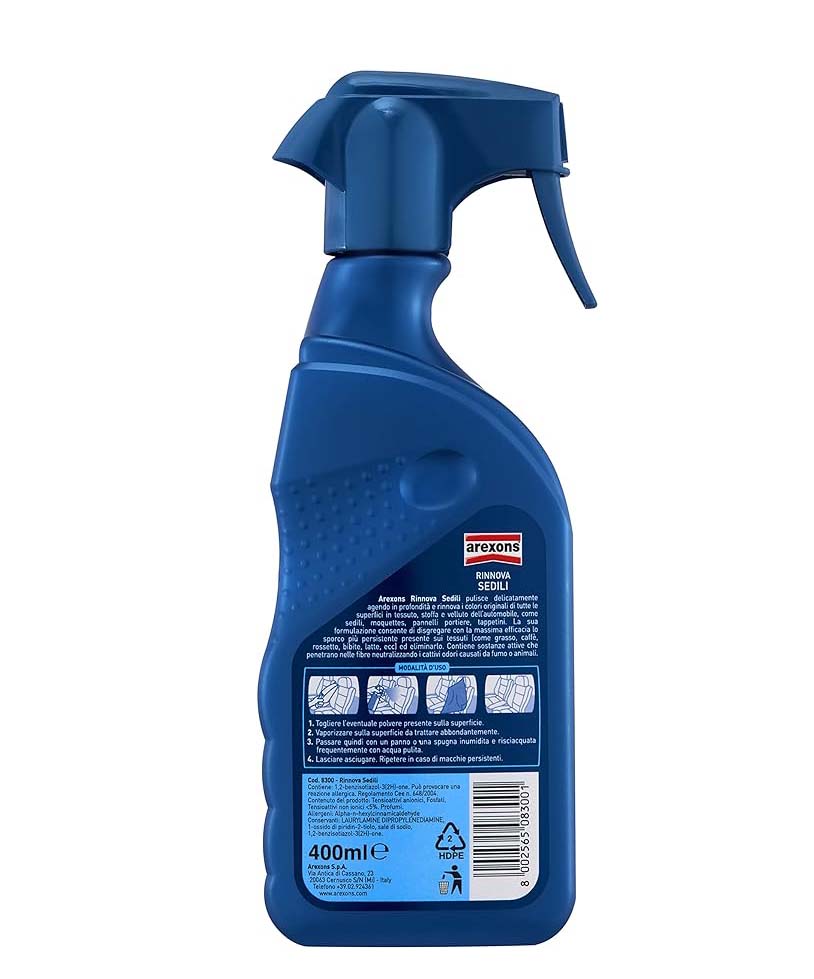 Pulisce delicatamente agendo in profondità e rinnova i colori originali di tutte le superfici in tessuto, stoffa e velluto dell'automobile come sedili, moquettes, pannelli portiere, tappetini. Contiene sostanze attive che penetrano nelle fibre neutralizzando i cattivi odori causati da fumo o animali.