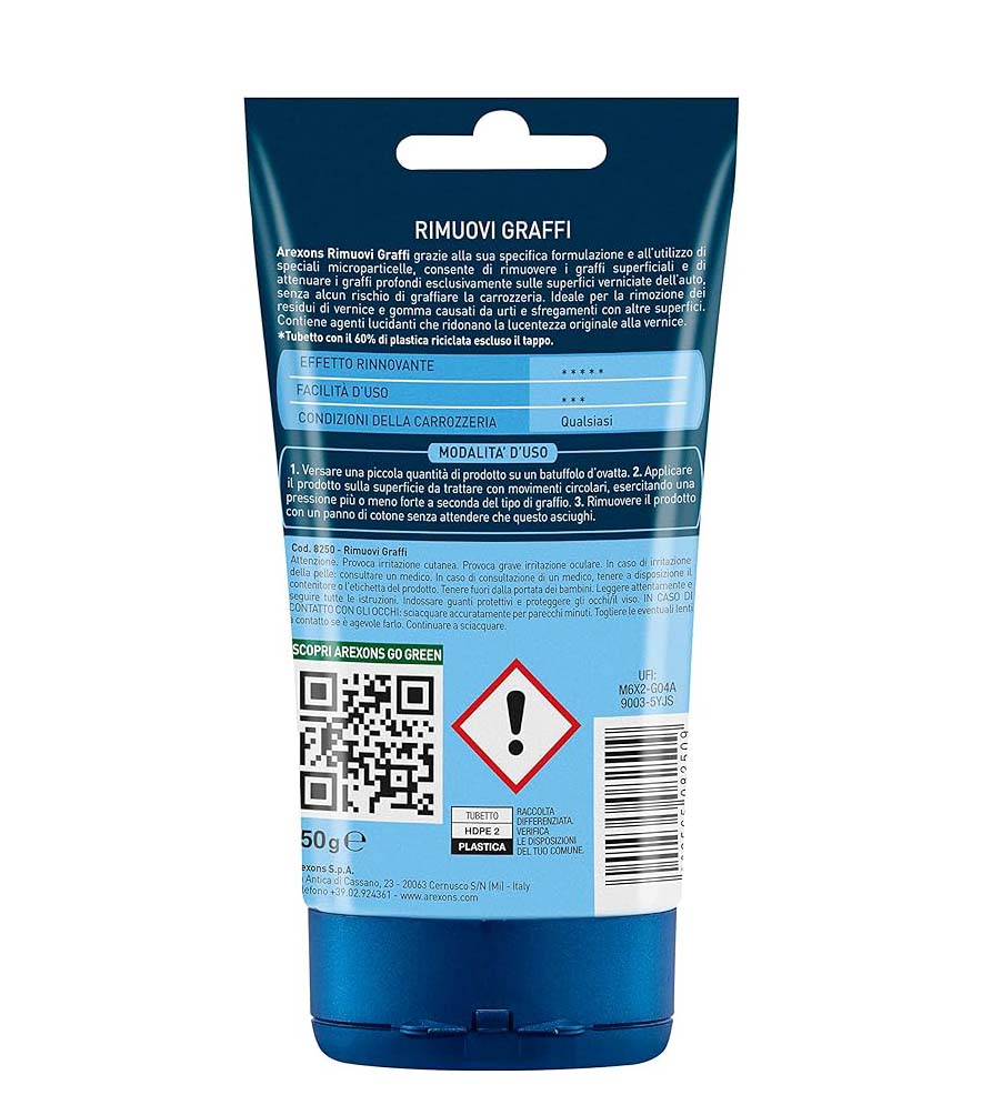 Grazie alla sua specifica formulazione e all'utilizzo di speciali microparticelle, consente di rimuovere i graffi superficiali e di attenuare i graffi profondi su tutte le superfici verniciate dell'auto senza alcun rischio di graffiare la carrozzeria. Ideale per la rimozione dei residui di vernice e gomma causati da urti e sfregamenti con altre superfici.