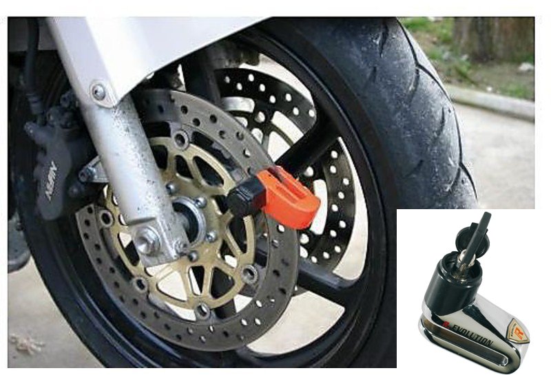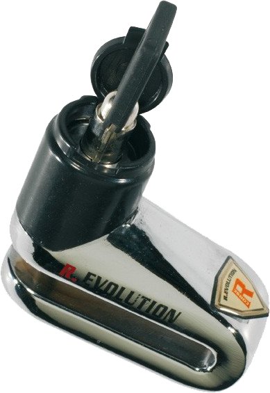 Speciale bloccadisco cromato con chiusura a prova d'acqua, dotato di perno passante per fori del disco freno sino a 5,5mm di diametro.