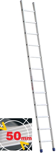 Professionale ad uso intensivo. Montante in alluminio elettrosaldato (sezione profilo mm 60x25 fino a 14 gradini, mm 73x25 da 15 gradini in poi), piolo comfort largo mm 50 in alluminio estruso antisdrucciolo. Portata kg 150. Conforme alle norme UNI EN 131.