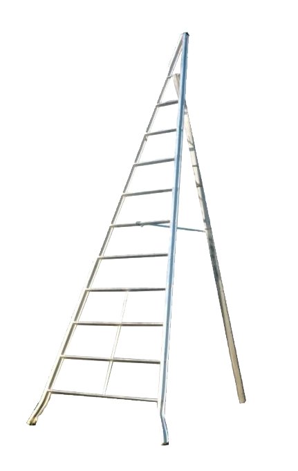 In alluminio specifica per uso agricolo, per la manutenzione di piante e siepi oltre che la raccolta di frutta. I gradini a trapezio inclinato favoriscono le lunghe soste dei piedi che appoggiano in piano e non stancano le gambe, sono passanti al montante, ribordati e saldati per massima sicurezza strutturale. Montanti tubolari nervati 30x65 mm. Telaio di salita ampiamente conico per la totale stabilità anche su terreni sconnessi. La scala termina a punta in alto per infilarsi nei rami.