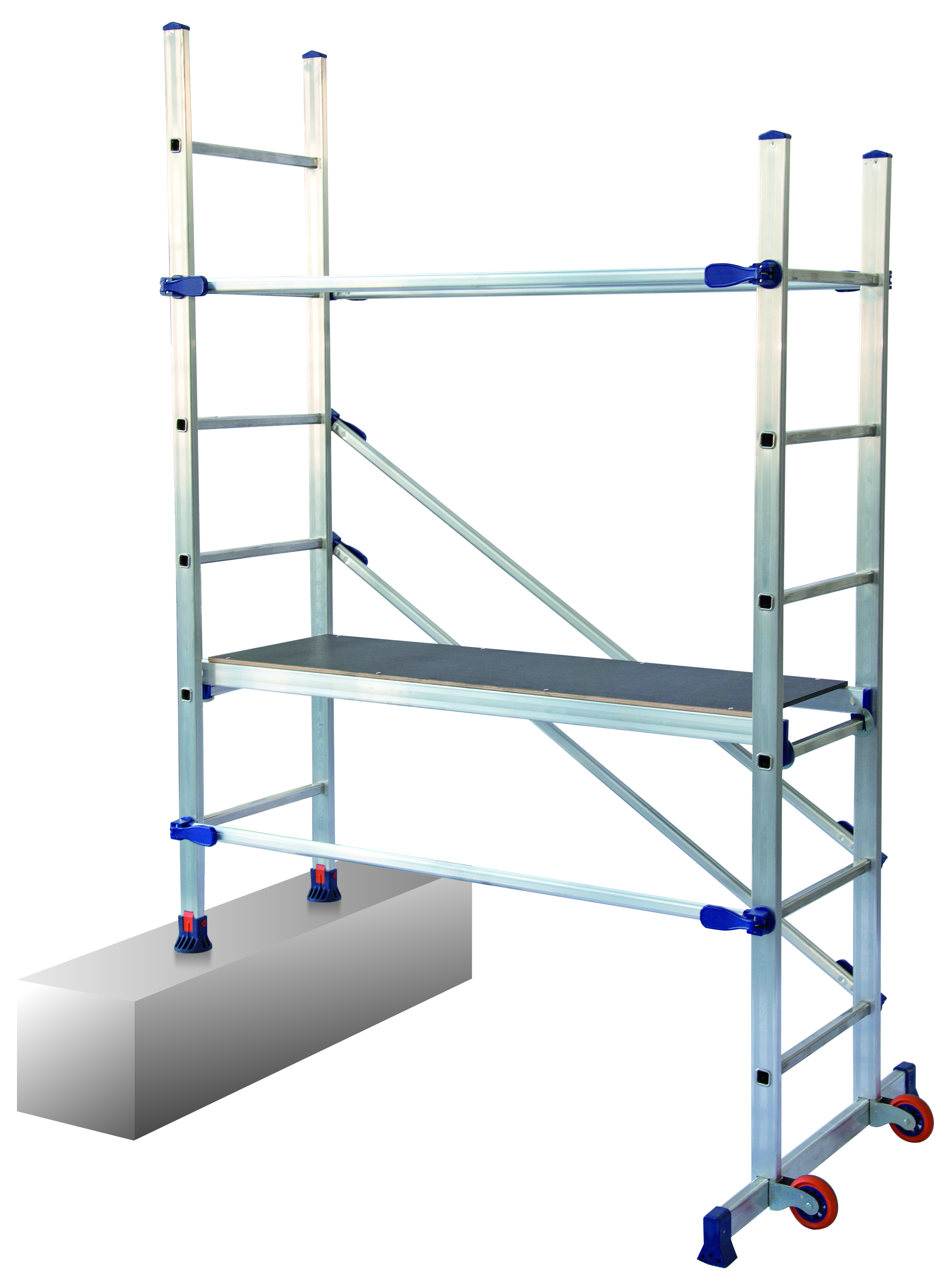 Trabattello completamente in alluminio di rapido montaggio, reso particolarmente solido e compatto dalle leve Pinna ad espansione. 4 ganci di sicurezza sul pianale. Barra stabilizzatrice con ruote inattive da un lato, dal lato opposto la spalla è parallela a terra con otturatori rigidi ad accogliere due flange in resina morbida a protezione di pavimenti in genere. Otturatori rigidi con flange antigraffio morbide. Ruote inattive. Dimensione piano di lavoro 125x41. Peso 14,6Kg.