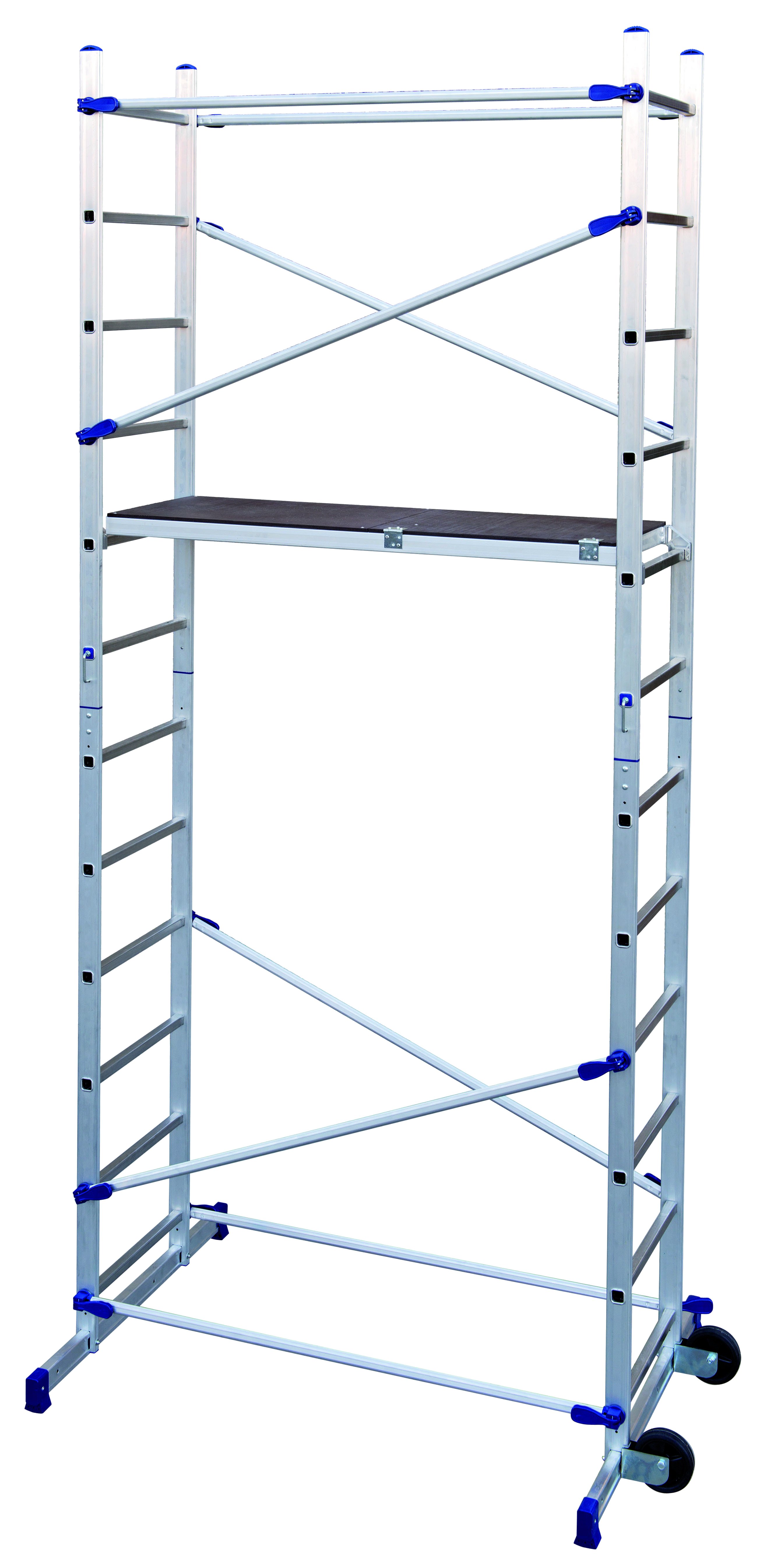 Trabattello completamente in alluminio a due alzate con innesti d'acciaio rivestiti di speciali resine. Collegamenti orizzontali e diagonali istantanei con espansori nei fori dei gradini. Lunghe leve di facile uso. Montante 24x60 mm. Gradini 30x30 mm. Base 6 gradini. Sopralzo 6 gradini. Piano in alluminio e legno antiscivolo, idroresistente, melaminico da 51x143 cm. Ampia botola da 61x46 cm per il passaggio. Due pratiche ruote da Ø 150 mm e supporto in acciaio per un facile spostamento. Forti ganci di ancoraggio saldati al pianale. Innesti d'acciaio ricoperti in resina. Dimensione base: 114x156 cm, dimensione struttura 58x156 cm. Portata 150 Kg. Conforme alle norme NFE85-200 e D.lgs. 206/2005.