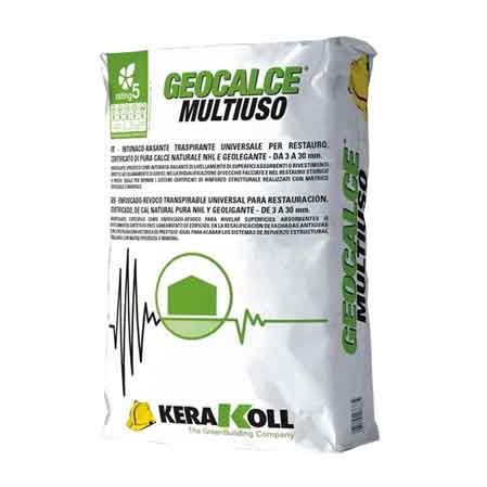 Traspirante universale certificato di pura calce naturale NHL e Geolegante da 3 a 30 mm. Specifico come rasante‑intonaco di livellamento di superfici assorbenti o rivestimenti sintetici nel risanamento di edifici, nella riqualificazione di vecchie facciate e nel Restauro Storico di pregio. Grazie alle sua proprietà è specifico come presidio antiribaltamento di tamponature e presidio antisfondellamento di solai in laterocemento. Ideale per rifinire i sistemi certificati di rinforzo strutturale realizzati con matrice epossidica o minerale. Classe di resistenza a compressione CS IV secondo en 998‑1 e Classe r1 secondo en 1504‑3.